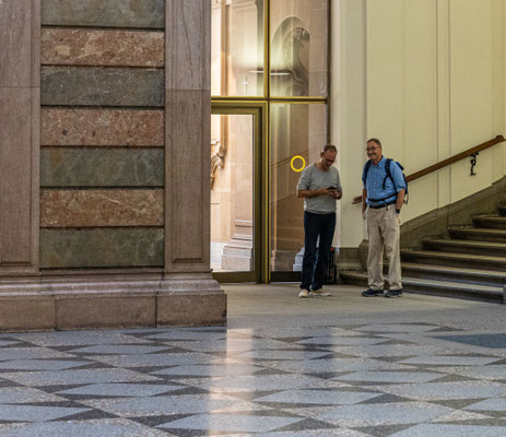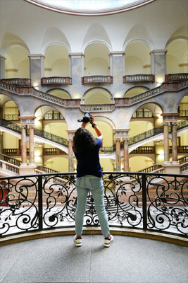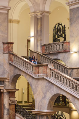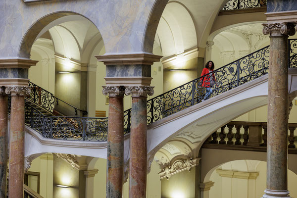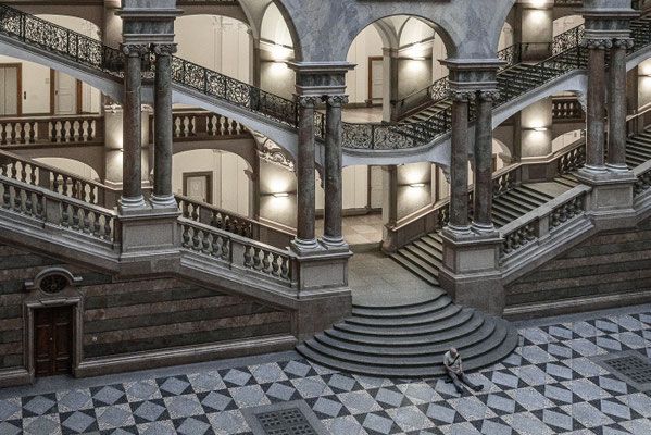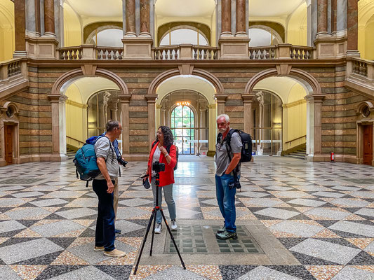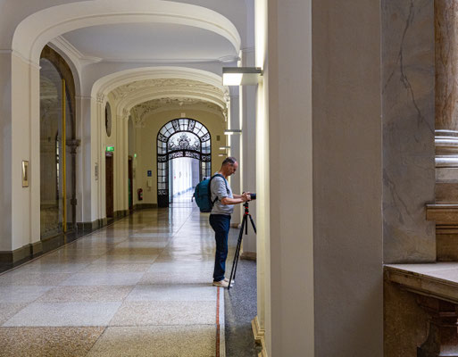 Das absolute Highlight des Justizpalastes ist das Treppenhaus in der Halle und Mittelpunkt des Gebäudes mit seiner beeindruckenden Glaskuppel. Hier erhält man durch die starken Linien und Symmetrie eine super Spannung, mit einem guten Weitwinkel lässt sich die räumliche Tiefe sehr betonen. Wir waren am Nachmittag hier und konnten durch das einfallende Licht außergewöhnliche Effekte erzielen